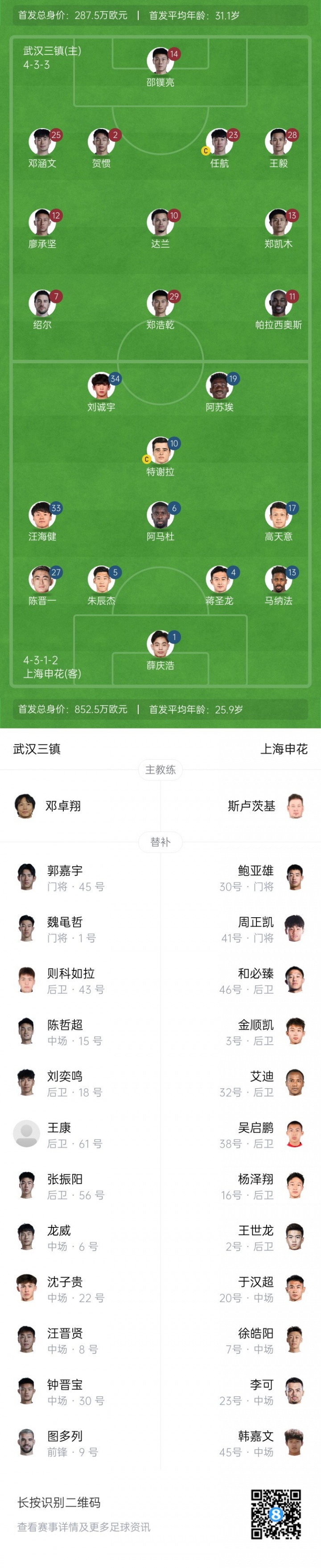 08月31日讯 北京时间19点,中超第23轮,武汉三镇主场迎战上海申花,赛前双方公布首发。